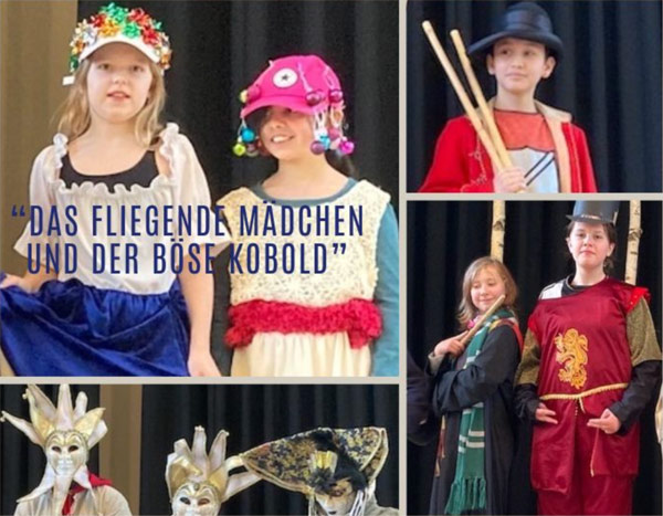 Mit einem fantastischen Bühnenprogramm hat die aus Fünftklässlern bestehende Theater-AG gestern Abend für Standing Ovations und einen minutenlangen Applaus in der Aula gesorgt. Mit dem selbst geschriebenen Stück „Das fliegende Mädchen und der böse Kobold“, viel Energie, toller Musik und beeindruckender Textsicherheit begeisterten die Schüler*innen nicht nur ihre Lehrkräfte sondern auch viele Eltern und einige neue 5er, die schon gespannt in der Aula saßen. Zum Nachlesen gibt es hier noch einmal den Flyer und das Programmheft – und wer es verpasst hat, sollte sich die Einschulungsfeier der neuen 5er merken! 😉